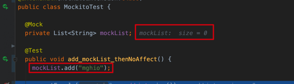 雖然我們已經在 mockList 對象上調用了 add 方法,但是實際上 mockList 集合中並沒有加入 mghio,這時候如果需要對 mock 對象有影響,那麼需要使用 spy 方式來生成 mock 對象。