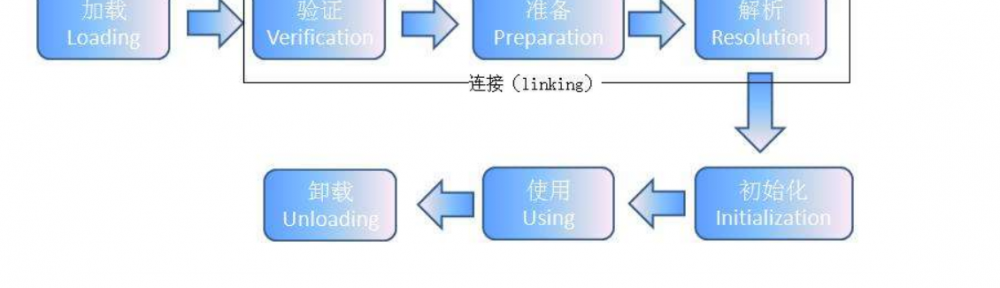 從上圖可知,類從被加載到虛擬機內存開始,到卸載出內存為止,它的整個生命周期包括 7 個階段,而驗證、準備、解析 3 個階段統稱為連接。