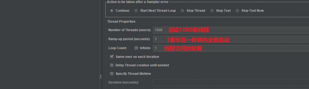 添加線程組,每輪同時啟動1000條線程對系統進行壓測,重複1輪