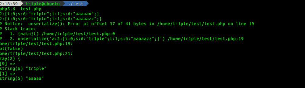 $username = 'tr1plexxxxxxxxxxxxxxxxxxxx";i:1;s:6:"123456";}'; //其中紅色就是我們想要注入的屬性值 $password="aaaaa"; $user = array($username, $password); echo(serialize($user)); echo "\n"; $r = filter(serialize($user)); echo($r); echo "\n"; var_dump(unserialize($r));