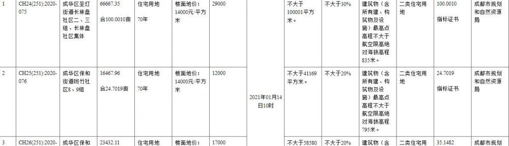 地塊編號CH25(251):2020-076號,地塊位於成華區保和街道,凈用地面積16467.96合24.7019畝,純住宅用地,計容面積不大於41169平方米,起始樓面地價14000元/㎡。