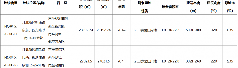 資料显示,該地塊編號為NO.新區2020G17,位於江北新區,東至規劃道路,  西至新浦路, 南至現狀,北至四方路。出讓面積23192.74㎡,起始價10.3億元,競買保證金5.15億元,建築密度≤20%,綠地率≥35%,建築高度50米<H<80米。