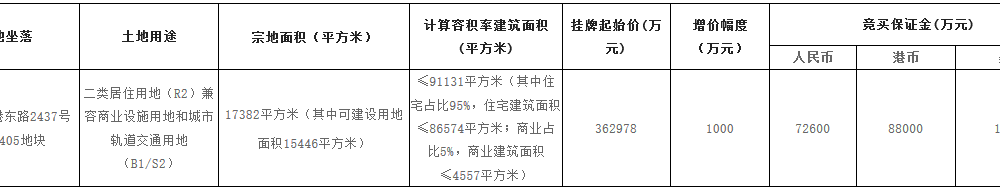 資料显示,該地塊編號為穗規劃資源掛出告字〔2020〕83號,位於海珠區新港東路2437號。宗地面積17382㎡,可建設用地面積15446㎡,計容建築面積≤91131㎡(其中住宅佔比95%,住宅建築面積≤86574㎡;商業佔比5%,商業建築面積≤4557㎡),起始價362978萬元,競買保證金72600萬元,最高限價為526319萬元。