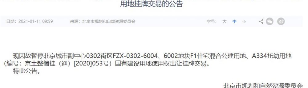 現因故暫停北京城市副中心0302街區FZX-0302-6004、6002地塊F1住宅混合公建用地、A334托幼用地(編號:京土整儲掛(通)[2020]053號)國有建設用地使用權出讓掛牌交易。