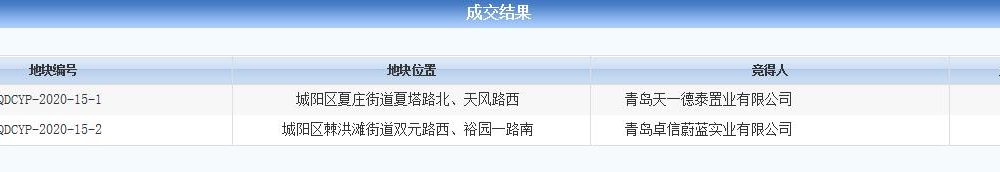 青島卓信蔚藍實業有限公司(卓越集團)以5.41億元競得QDCYP-2020-15-2號地塊。