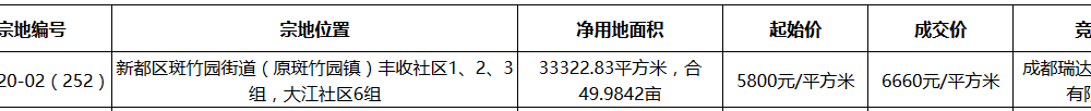 其中,成都瑞達合能有限公司(合能)以44386萬元競得XD2020-02(252)地塊,樓麵價6660元/㎡,溢價率14.83%。