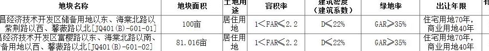 地塊編號DAGJ2020031,地塊位於南昌經濟技術開發區富櫻路以東、海棠北路以南、儲備用地以西、馨薇路以北,出讓面積81.016畝,為居住用地,容積率1<FAR≤2.2,建築密度D≤22%,綠地率GARR≥35%。起始價5.84億元,成交價7.79億元,溢價率33.43%,樓麵價8166.67元/平。