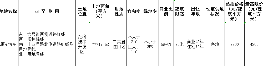 資料显示,該地塊編號為JK2020-008,位於經濟技術開發區,東至六號街西側道路紅線,西至規劃綠線,南至十四號路北側道路紅線及用地界線,北至用地界線。出讓面積77717.63㎡,競買保證金1.3億元,率≥35%,建築高度80米。
