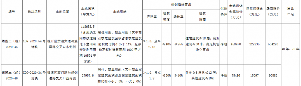 資料显示,該地塊編號為錫國土(經)2020-45,位於經開區貢湖大道與震澤路交叉口東北側。出讓面積138059.5㎡,起始價458470萬元,最高限價為534290 萬元,競買保證金229235萬元,建築密度≤40%,率≥25%,建築高度:住宅建築≥18層,商業建築≤30米,滿足機場凈空要求。