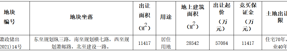 資料显示,該地塊編號為蕭政儲出(2021)14號,位於蕭山區,東至規劃縱三路,南至規劃橫七路,西至規劃蕭郵路,北至建設一路。出讓面積11417㎡,起始價5.71億元,競買保證金1.14億元。