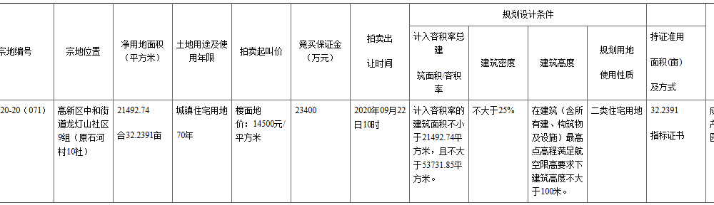資料显示,該地塊編號為GX2020-20(071),位於高新區中和街道龍燈山社區9組(原石河村10社)。凈用地面積21492.74㎡(合32.2391畝),起始價77911萬元,競買保證金23400萬元,建築密度≤25%。