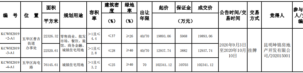 資料显示,3宗地塊編號為KCWH2019-2-A1、KCWH2019-3-A1、KCWH2019-4-A1號。