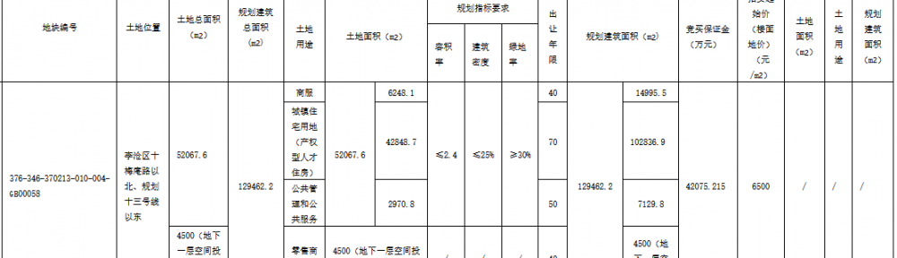 資料显示,該地塊編號為376-346-370213-010-004-GB00058,公告號為青自然資規告字[2020]26號,位於李滄區十梅庵路以北、規劃十三號線以東。規劃建築面積129462.2㎡,起始價8.415億元元,競買保證金4.21億元,建築密度≤25%,率≥30%。