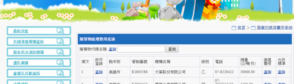 相關資訊可查詢「」,路徑為系統首頁\各類清理機構查詢\廢棄物處理費用查詢,當廢棄物產源事業於查詢廢棄物許可處理機構資料時,即可查看該處理機構處理費用收費範圍,以提供價格合理的服務機構。